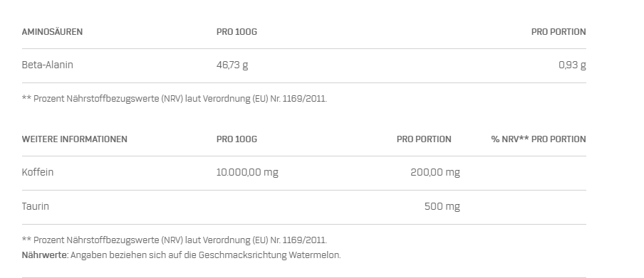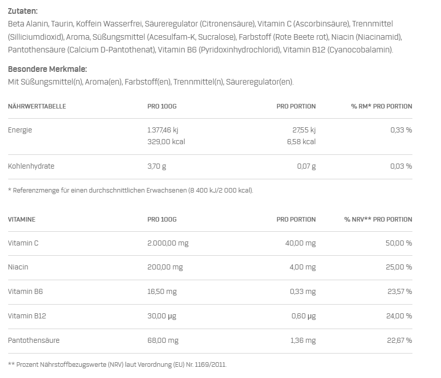 Hinweis: Die angegebene empfohlene tägliche Verzehrsmenge darf nicht überschritten werden. Das Nahrungsergänzungsmittel nicht als Ersatz für eine ausgewogene und abwechslungsreiche Ernährung verwenden. Außerhalb der Reichweite von Kindern aufbewahren. Enthält Koffein (200mg/ Portion). Für Kinder und schwangere Frauen nicht empfohlen.