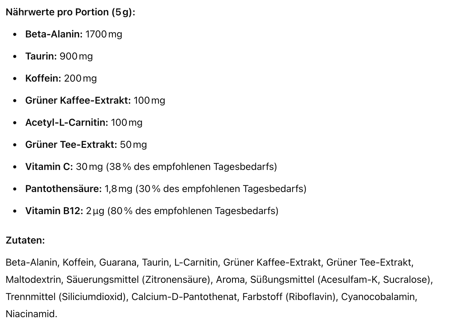 - Steigerung der Leistungsfähigkeit: Beta-Alanin und Koffein erhöhen die Ausdauer und Energie während des Trainings.