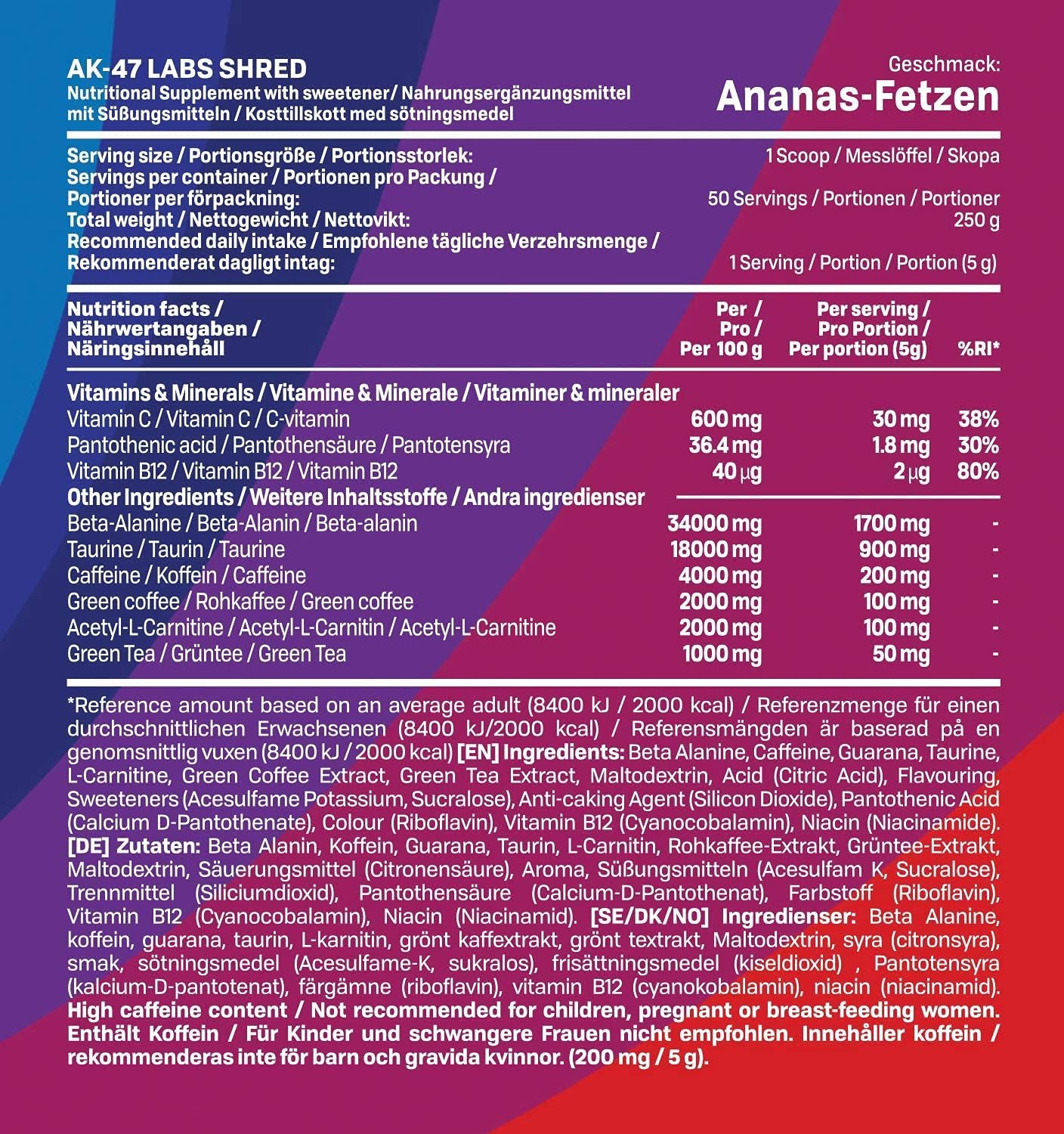 Der AK47 Labs Shred 250 g ist ein vielseitiger Pre-Workout-Booster, der gleichzeitig als Unterstützung während Diätphasen dient. Er kombiniert klassische Pre-Workout-Komponenten wie Beta-Alanin und Koffein mit Inhaltsstoffen wie L-Carnitin, Grüntee- und Grüner-Kaffee-Extrakt, die den Stoffwechsel anregen und die Fettverbrennung fördern können. Erhältlich in verschiedenen Geschmacksrichtungen wie Pineapple Punch und Raspberry Lemonade, bietet er ein erfrischendes Geschmackserlebnis vor dem Training.
