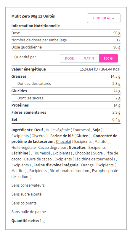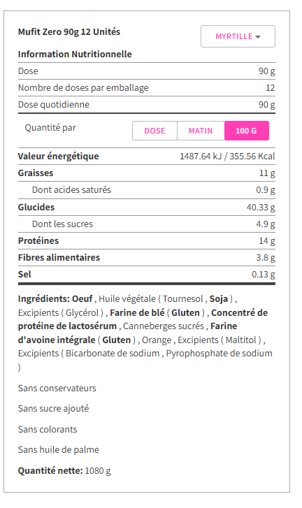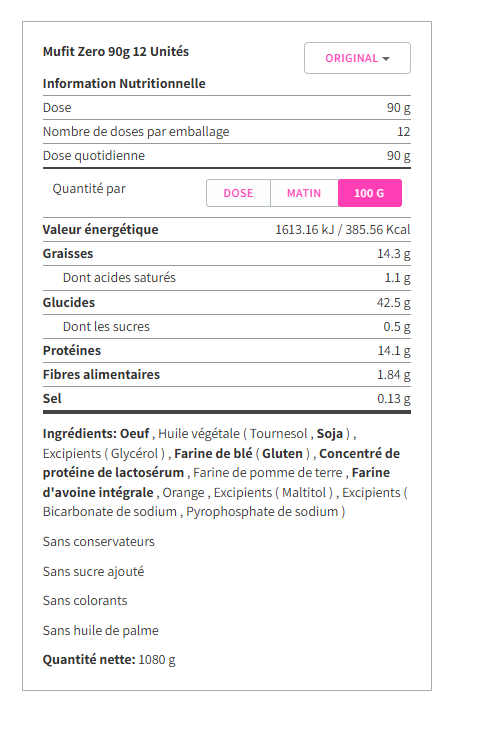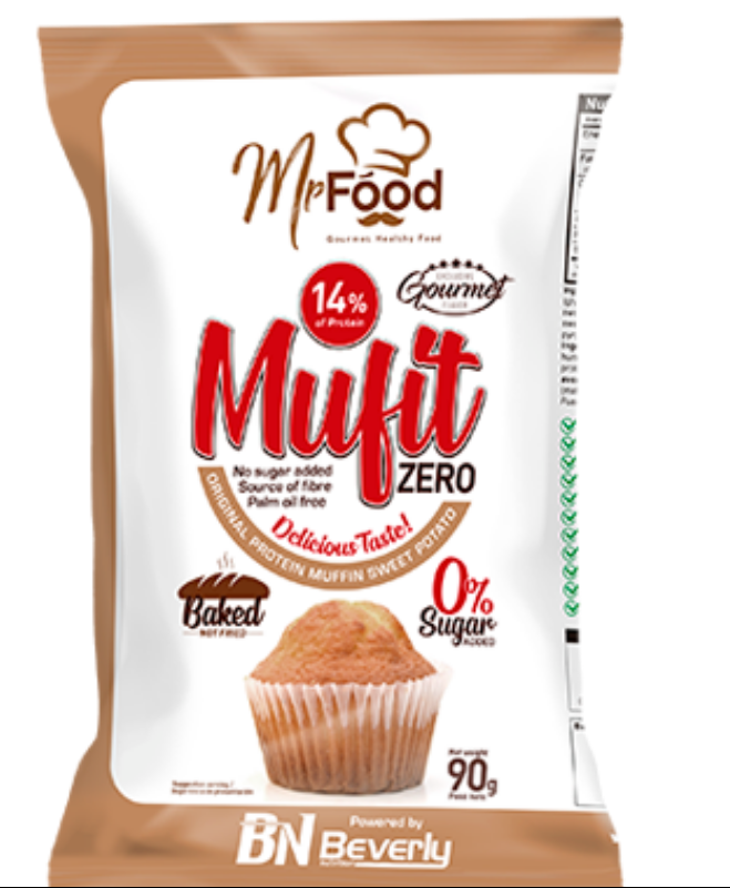 Wir präsentieren Ihnen die neuen MUFIT ZERO aus unserer neuen MrFood-Linie. MUFIT ZERO sind leckere, gesunde und ausgewogene Muffins mit 14% Protein der höchsten biologischen Wertigkeit (Eiweiß und konzentriertes Molkenprotein). Sie sind ein wirklich gesundes Lebensmittel, da sie Ballaststoffe liefern, keinen zugesetzten Zucker enthalten, gebacken (nicht frittiert) sind und kein Palmöl, keine Farbstoffe, keine Konservierungsstoffe, kein Cholesterin, keine Transfette und kein allergenes Soja enthalten.