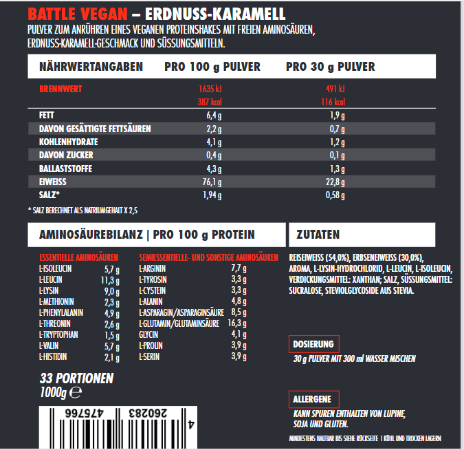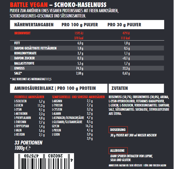 Alle 3 Faktoren haben wir uns beim neuen Battle Vegan zunutze gemacht. Die neue Formel besitzt mit rund 75 % einen hohen Proteingehalt, der sich aus einer ausgeklügelten Kombination aus Reisprotein und Erbsenprotein zusammensetzt. Allein diese Kombination in genau diesem Verhältnis, gleicht das Aminosäurenprofil so weit aus, dass man es als komplettes und hochwertiges Protein bezeichnen kann. Trotzdem sind wir einen Schritt weiter gegangen und haben zusätzlich die kritischen Aminosäuren in freier Form nach dem Vorbild unseres Battle Whey’s ergänzt, um eine vergleichbar hohe Proteinqualität zu erreichen.