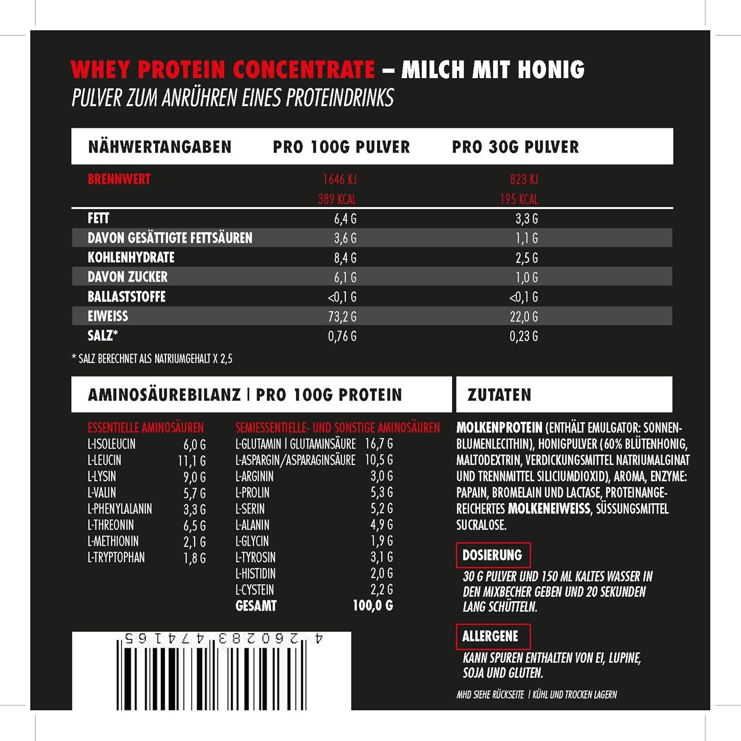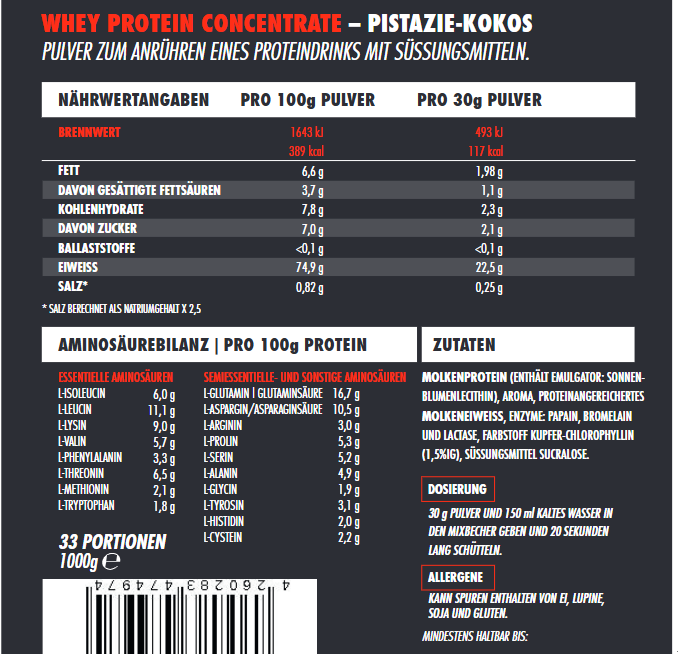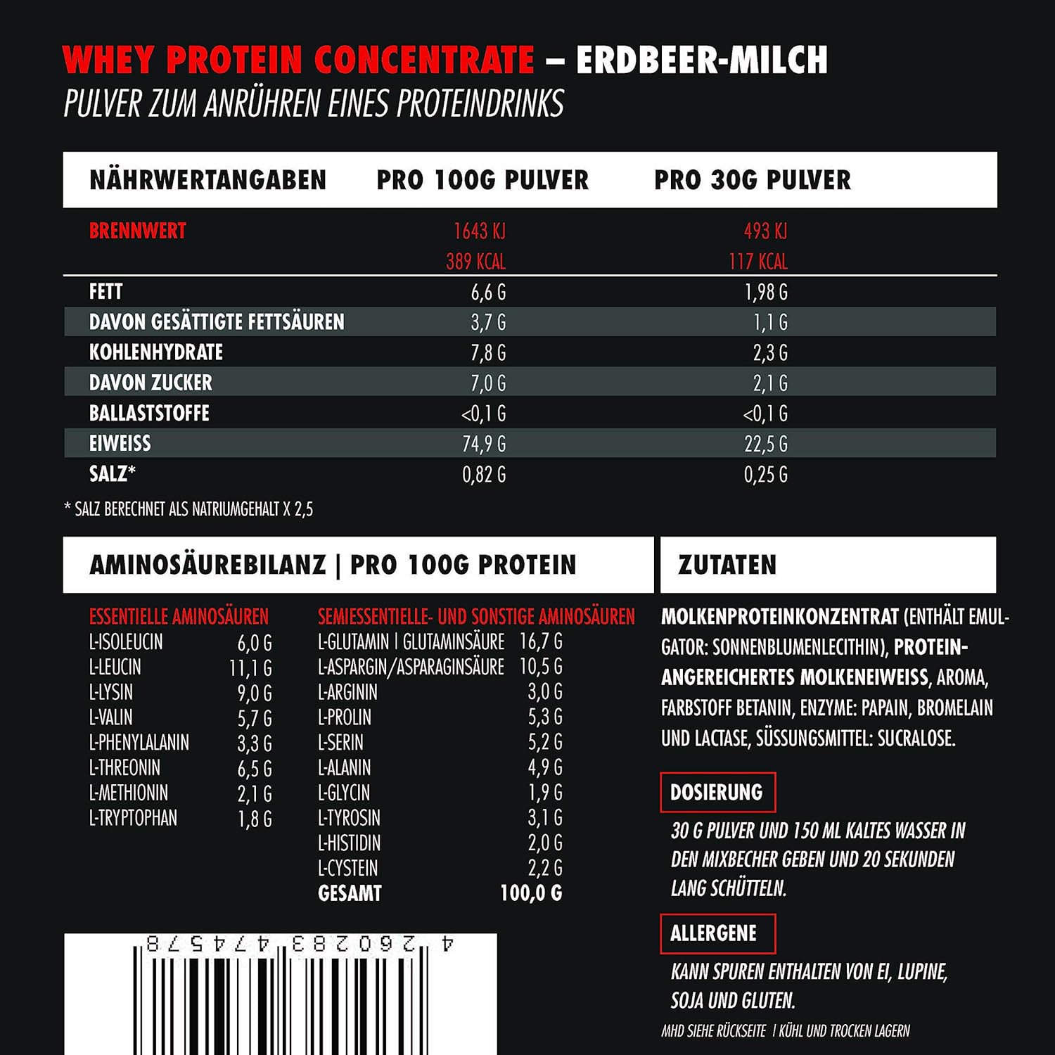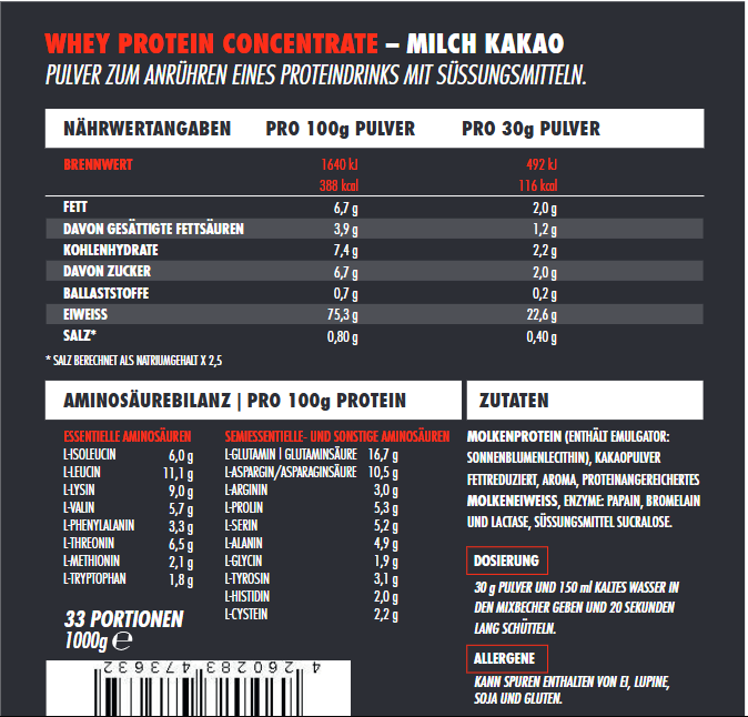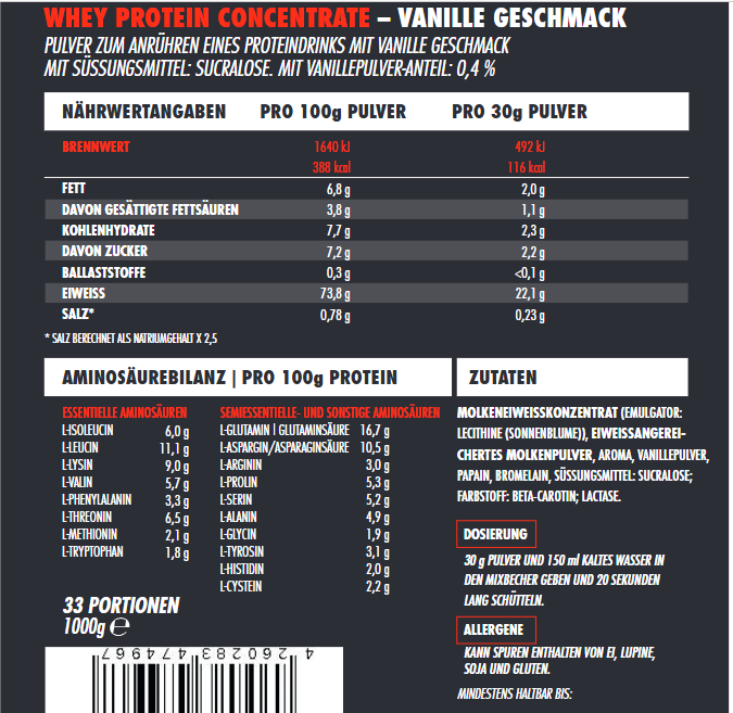 Vermerk zur Analyse: Aminosäuren wurden auf 100g Pulver berechnet!