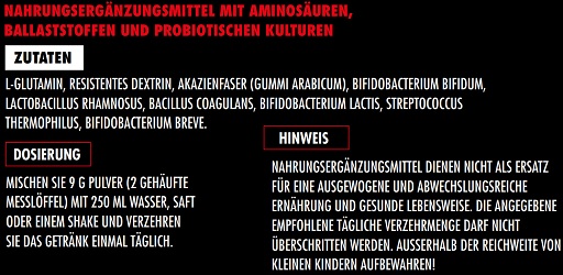 Das SHIELD Performance Synbiotikum sollte ein- bis zweimal täglich zu einer Mahlzeit eingenommen werden. Eine Portion entspricht 9 g. Mischen Sie diese in einer beliebigen Menge Wasser oder anderen kalten Flüssigkeiten. Das SHIELD Performance Synbiotikum sollte nicht erhitzt oder mit heißen Flüssigkeiten gemixt werden.