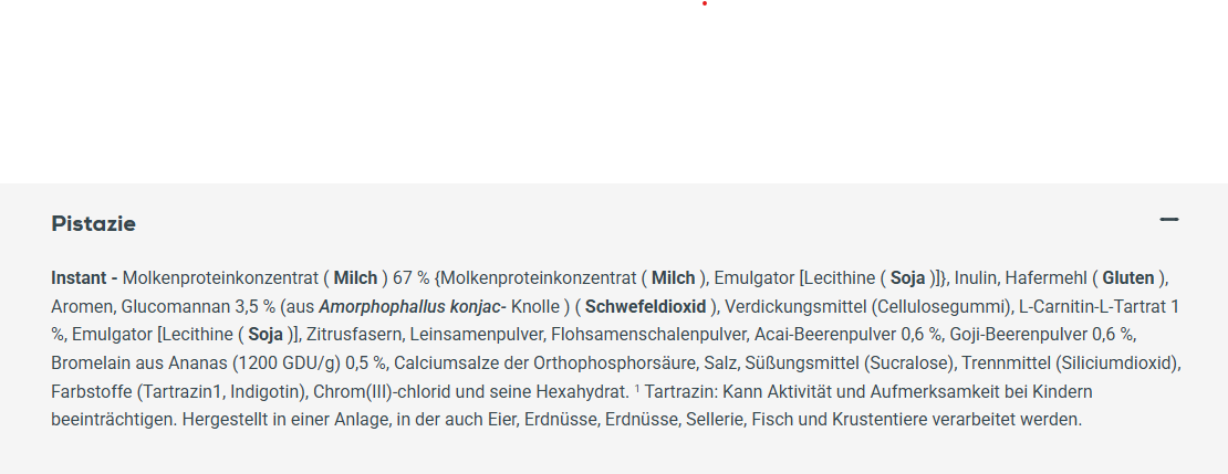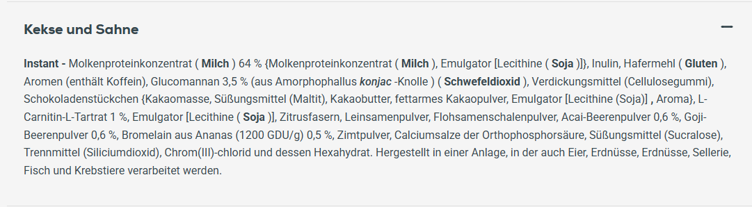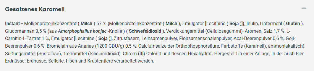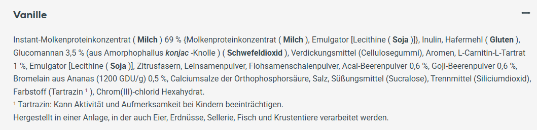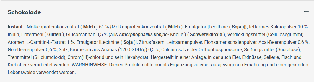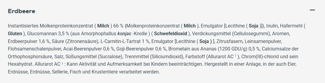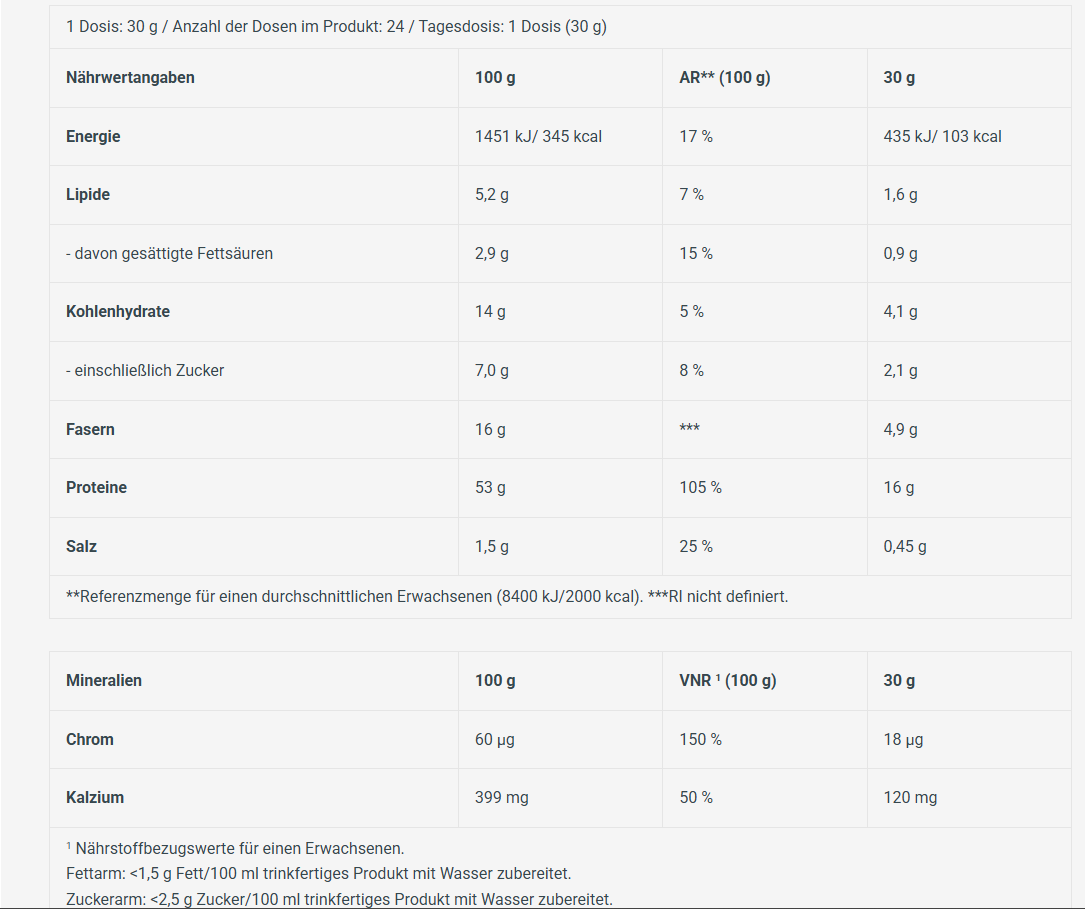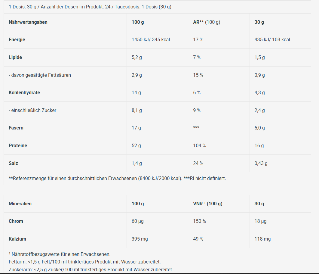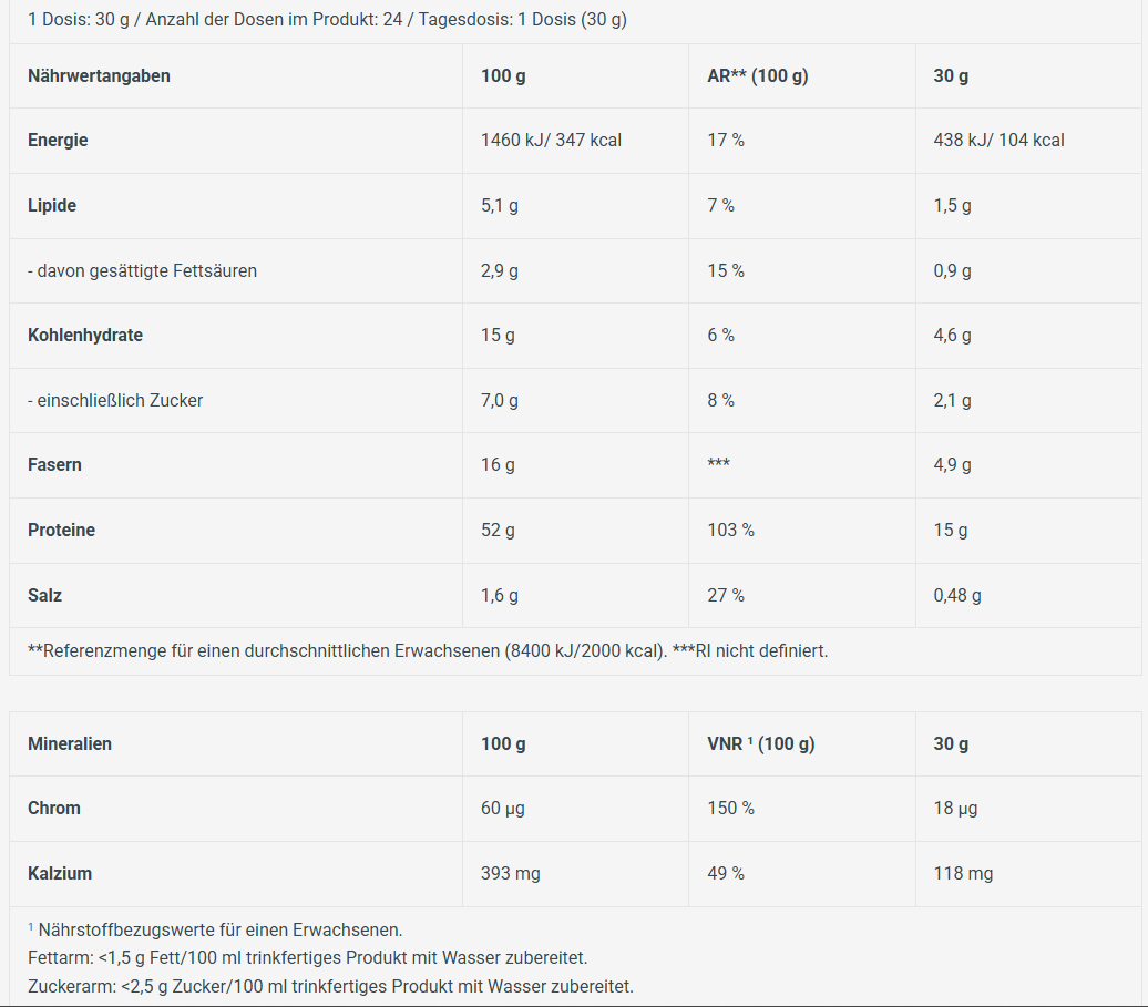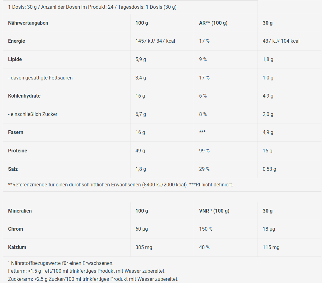 Das Produkt enthält Koffein [10 mg Koffein/Portion (3,3 mg Koffein/100 ml trinkfertiges Getränk)]. Für Kinder und schwangere Frauen nicht empfohlen. Dieses Produkt sollte nicht als Ersatz für eine ausgewogene, abwechslungsreiche Ernährung und gesunde Lebensweise verwendet werden. Produkt außerhalb der Reichweite von kleinen Kindern aufbewahren. Kühl und trocken lagern.