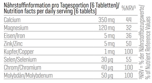Calciumcitrat, Füllstoff (Cellulose), Magnesiumcitrat, Magnesiumoxid, pflanzliches Fett (Palm (ganz gehärtet)), Trennmittel (Magnesiumsalze der Speisefettsäuren), Stabilisator
