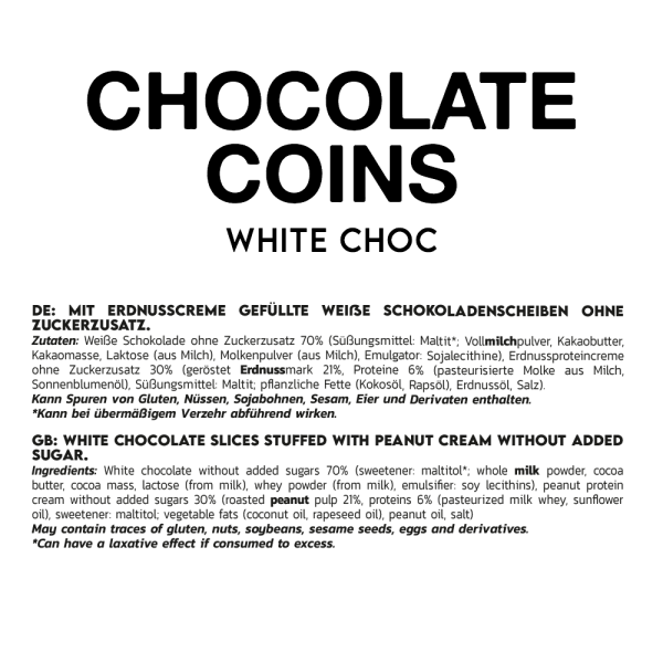 Erlebe den unwiderstehlichen Geschmack der INLEAD Chocolate Coins! Unsere köstlichen Schokomünzen sind nicht nur mit hochwertiger Milchschokolade oder weißer Schokolade umhüllt, sondern auch gefüllt mit einer leckeren Erdnussbutter-Creme. Diese einzigartige Kombination aus Schokolade und Erdnussbutter verleiht unseren Chocolate Coins einen unverwechselbaren Geschmack und macht sie zur perfekten Leckerei für alle Schokoladenliebhaber, die nach einem süßen Genuss suchen. Unsere Chocolate Coins enthalten keinen zugesetzten Zucker, sodass du dich bedenkenlos verwöhnen lassen kannst. Ob als Snack zwischendurch oder als Topping für Desserts, Backwaren und vieles mehr – unsere Chocolate Coins sind vielseitig einsetzbar und ein echtes Geschmackserlebnis.