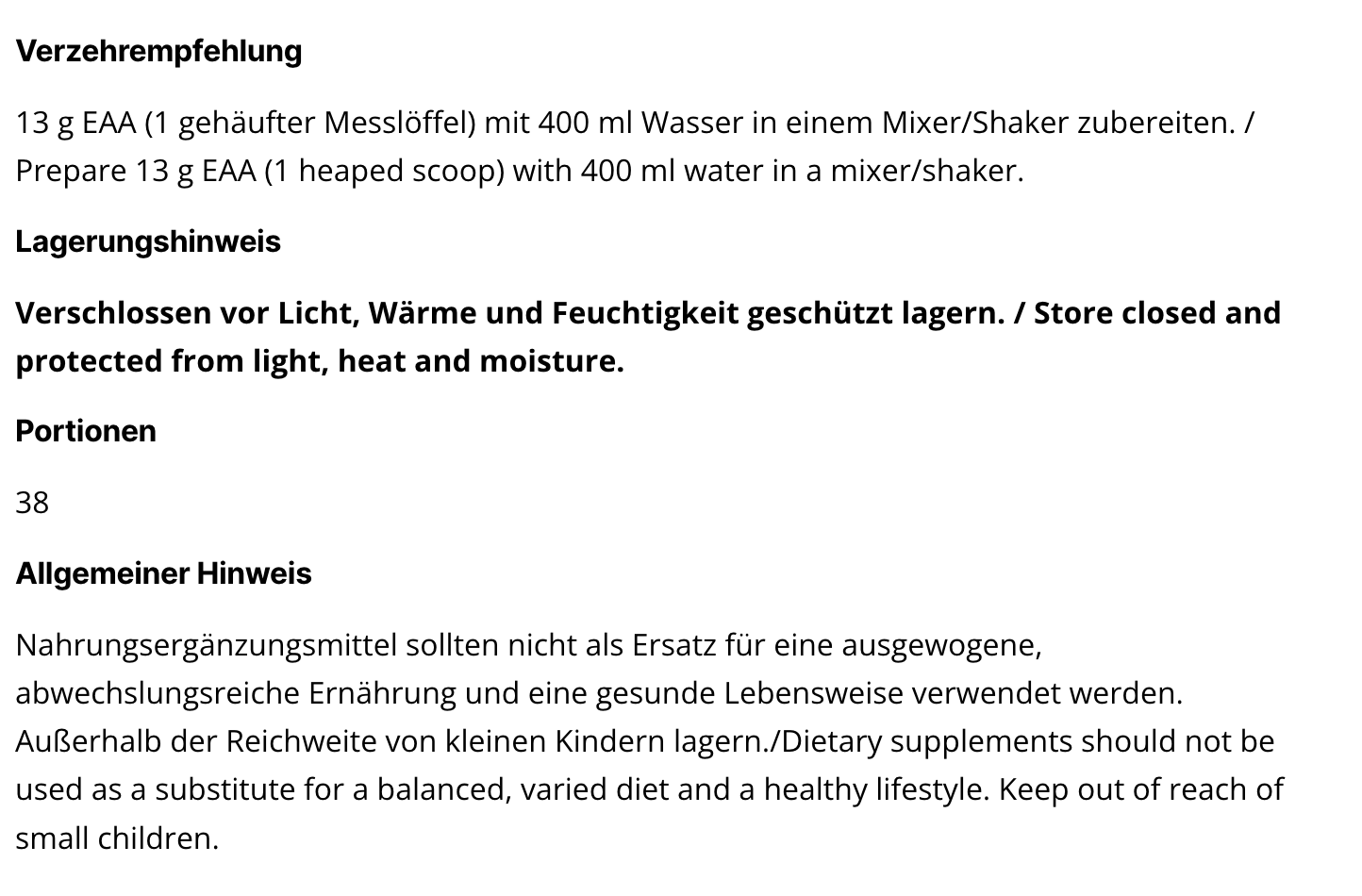 13 g EAA (1 gehäufter Messlöffel) mit 400 ml Wasser in einem Mixer/Shaker zubereiten. / Prepare 13 g EAA (1 heaped scoop) with 400 ml water in a mixer/shaker.