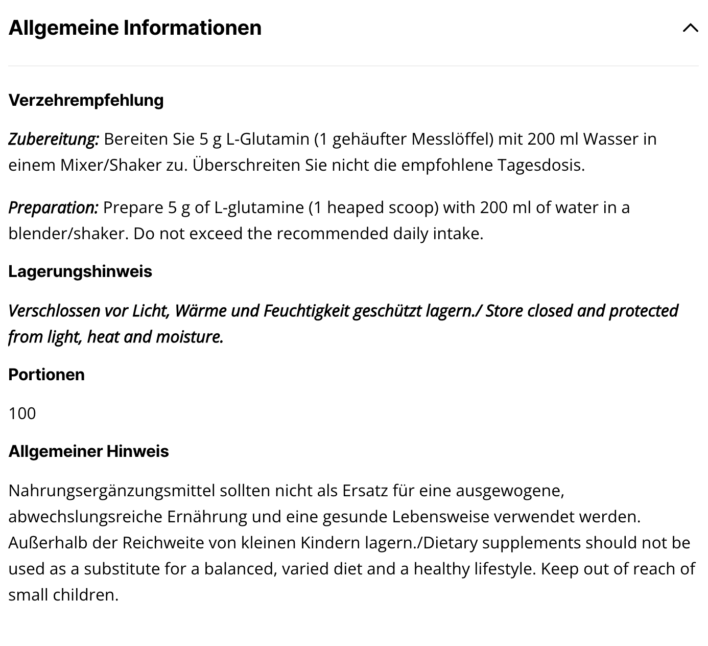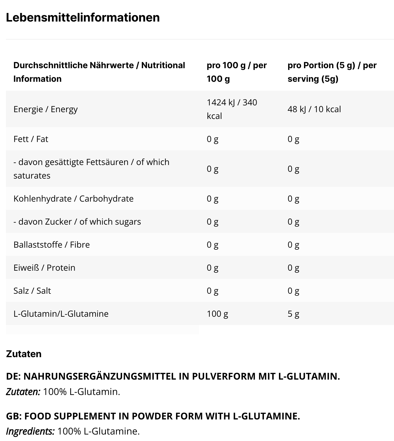 – Regeneration und Muskelsupport: L-Glutamin ist eine Aminosäure, die der Körper zur Unterstützung der Regeneration nutzen kann – ideal bei intensiven Trainingseinheiten.