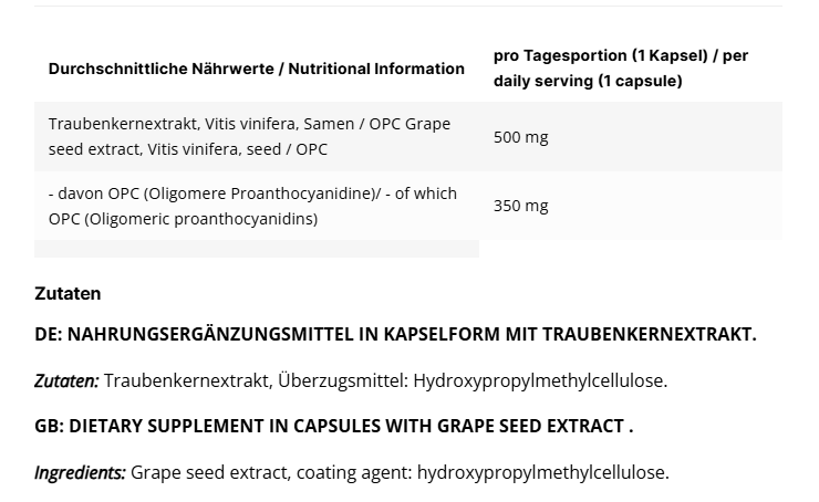 Entdecke die Kraft der Weintrauben mit hochdosiertem OPC (Oligomere Proanthocyanidine) aus Traubenkernextrakt – in nur 1 Kapsel pro Tag. INLEAD OPC Grape Seed Extract liefert 500 mg reinen Traubenkernextrakt (Vitis vinifera), davon 350 mg OPC.
