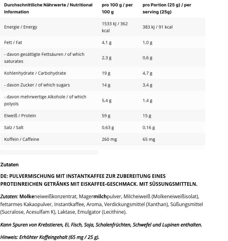 Ob in Wasser oder Milch – der Protein Iced Coffee schmeckt in jeder Variante und eignet sich perfekt als erfrischende Pause. Mit zusätzlicher Laktase ist er zudem ideal für Genießer mit Laktoseintoleranz.