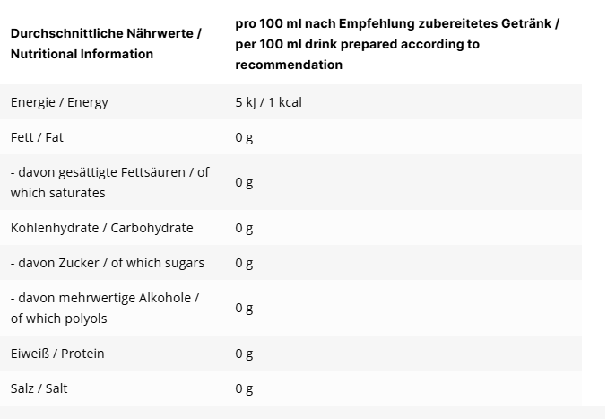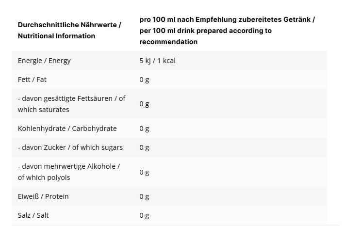 - Kalorienfrei: Genuss ohne Reue – 0 Zucker, 0 kcal.