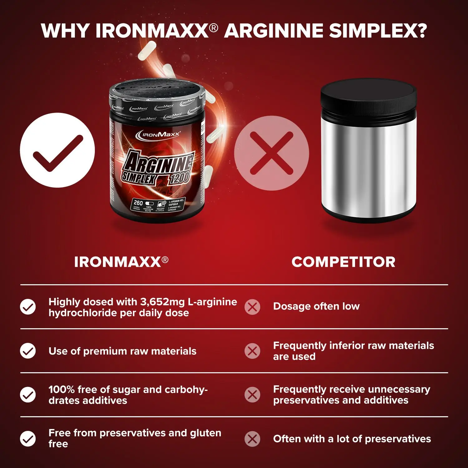 Das beliebte Arginin Simplex bietet IronMaxx® in 3 verschiedenen Versionen für dich an. Diese Versionen unterscheiden sich in ihrer Dosierung sowie in ihrer Kapselgröße. Unsere hochkonzentriertesten Arginin Kapseln sind die Arginin Simplex 1600. Sie versorgen deinen Körper mit starken 4500mg L-Arginin-Hydrochlorid und damit mit 3735mg purem L-Arginin. Für so viel Inhalt sorgen unsere XXL-Tricaps®-Kapseln. Sie bieten ein enormes Füllgewicht und überzeugen somit mit mehr Inhalt als herkömmliche Standardkapseln und Tabletten. IronMaxx® hat sich für die Kapselform anstelle von Pulver entschieden, da Kapseln praktischer für eine Einnahme unterwegs sind. Damit sind sie eine erstklassige Alternative zu Kau- oder Schlucktabletten. Unsere Arginin Simplex-Kapseln sind vollkommen frei von Konservierungsstoffen und zeichnen sich durch Geschmacksneutralität aus.