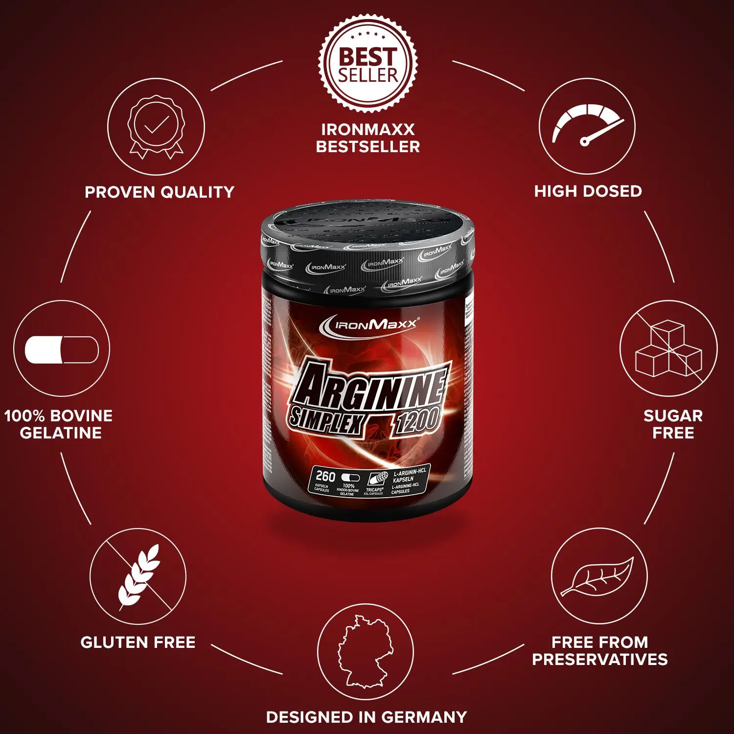Aminosäuren sind die Grundbausteine der Eiweiße und für den menschlichen Körper von immenser Bedeutung, da sie dort viele wichtige Aufgaben übernehmen. L-Arginin ist eine proteinogene α-Aminosäure und für den menschlichen Körper semi-essentiell, also kann der menschliche Körper nur bedingt L-Arginin produzieren. Arginin wird deshalb nämlich als semi-essentiell bezeichnet, da dein Körper in stressigen Situationen (anstrengende Trainingssessions, Alltagsstress) mit der Produktion nicht vollkommen nachkommt. Wenn dies der Fall ist und dir Aminosäuren fehlen, ist eine volle Leistungsfähigkeit nicht mehr gewährleistet. Aus diesem Grund ist es oft sinnvoll L-Arginin zu supplementieren. IronMaxx® Arginin Simplex 1600 Kapseln sind die Lösung für deinen Bedarf an Arginin in stressigen Situationen. Für volle Leistung anstatt Leerlauf!