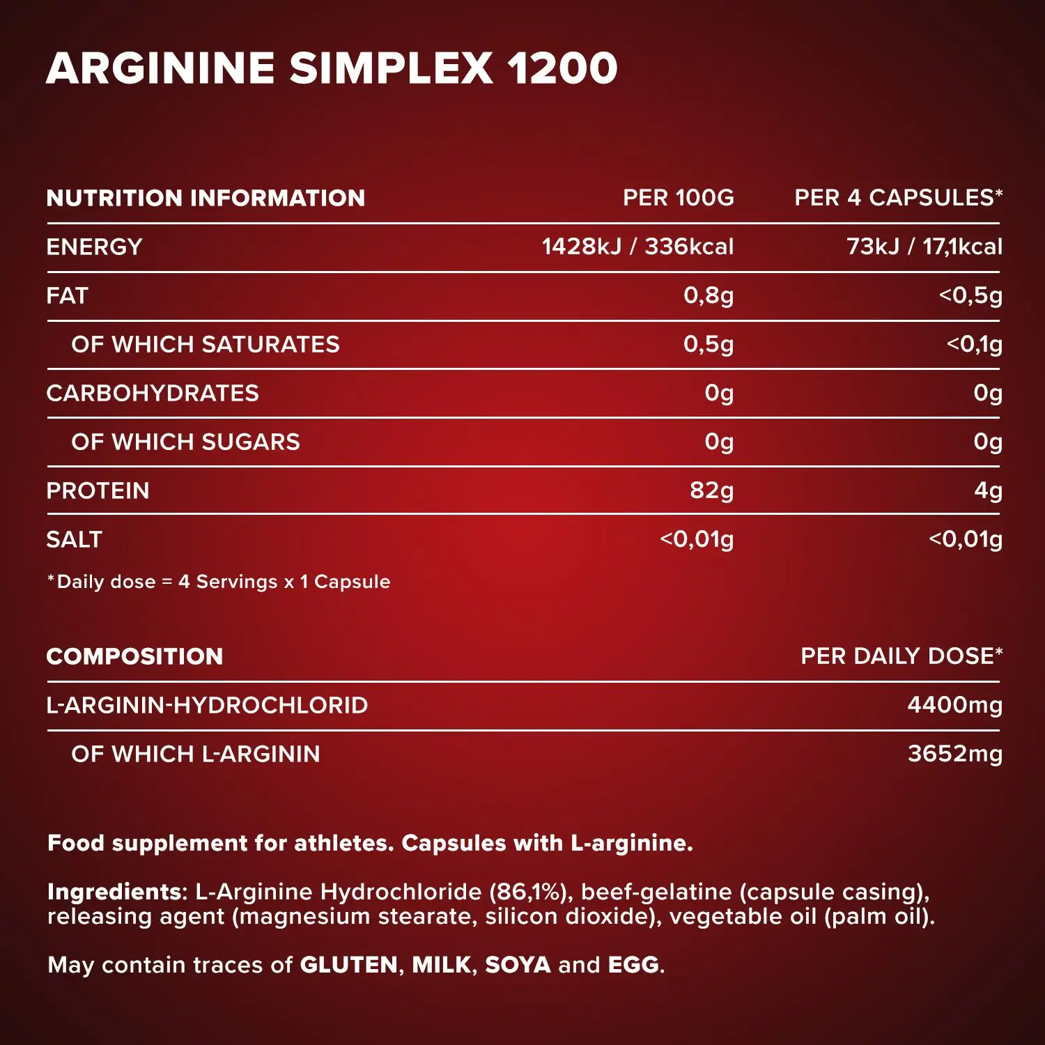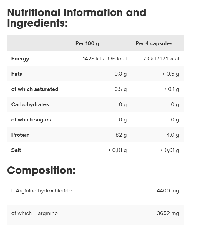 L-Arginin-Hydrochlorid (89,7%), Rindergelatine (Kapselhülle), Trennmittel (Magnesiumsalze der Speisefettsäuren).