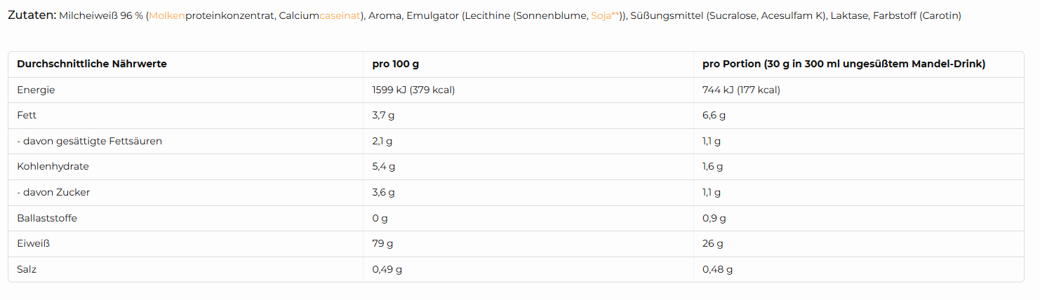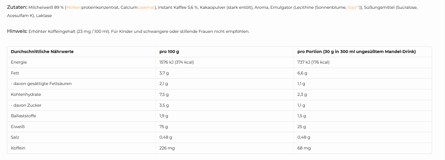 Bezeichnung: Pulver zur Herstellung eines proteinreichen Getränkes. Mit Süßungsmittel(n).