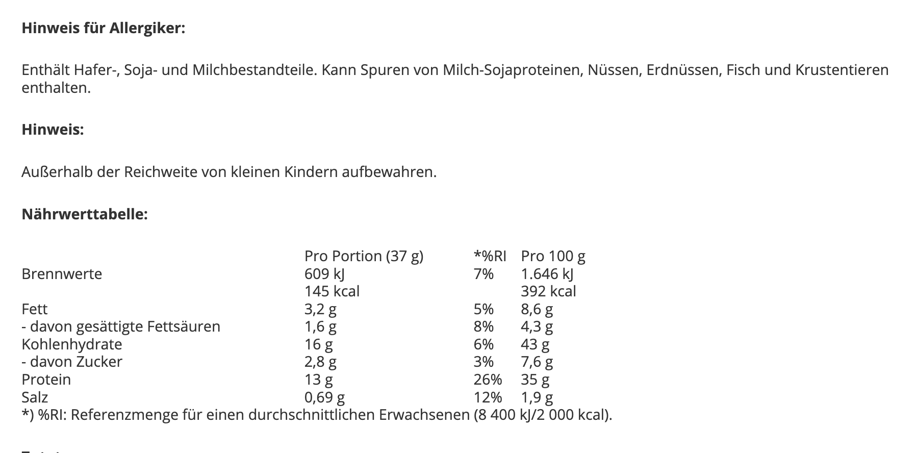 Hinweis für AllergikerKann Spuren von Milch-Sojaproteinen, Nüssen, Erdnüssen, Fisch und Krustentieren enthalten.